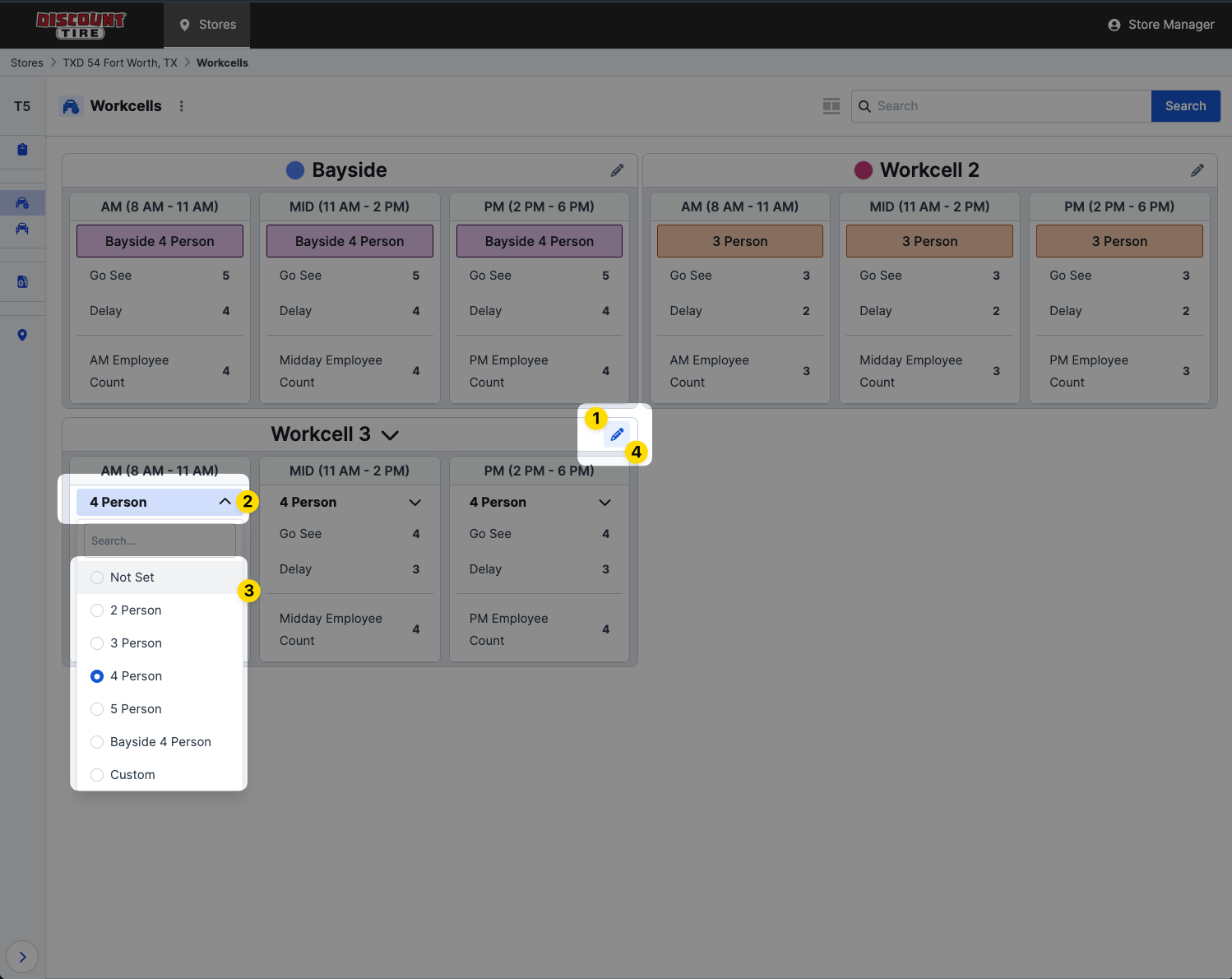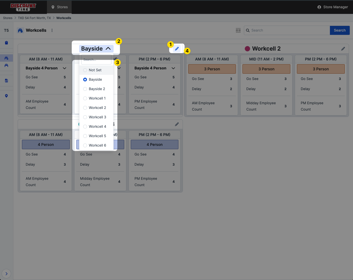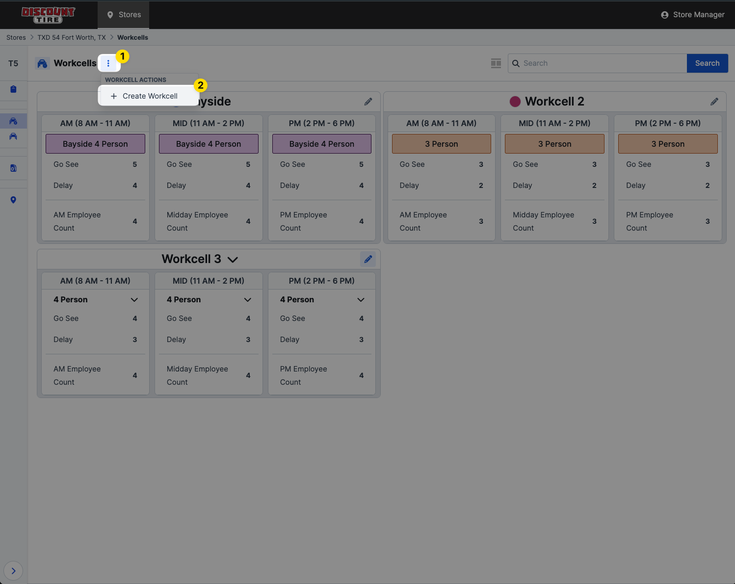 The Workcell Configuration Page displays all the current workcells in a store, providing key information such as name, color of workcell, type, timeblock, play, employee count, go see threshold, and delayed threshold. These thresholds determine when your workcell’s hourly vehicle metrics change to yellow or red. Store Managers can create, edit, and delete workcells from this page.