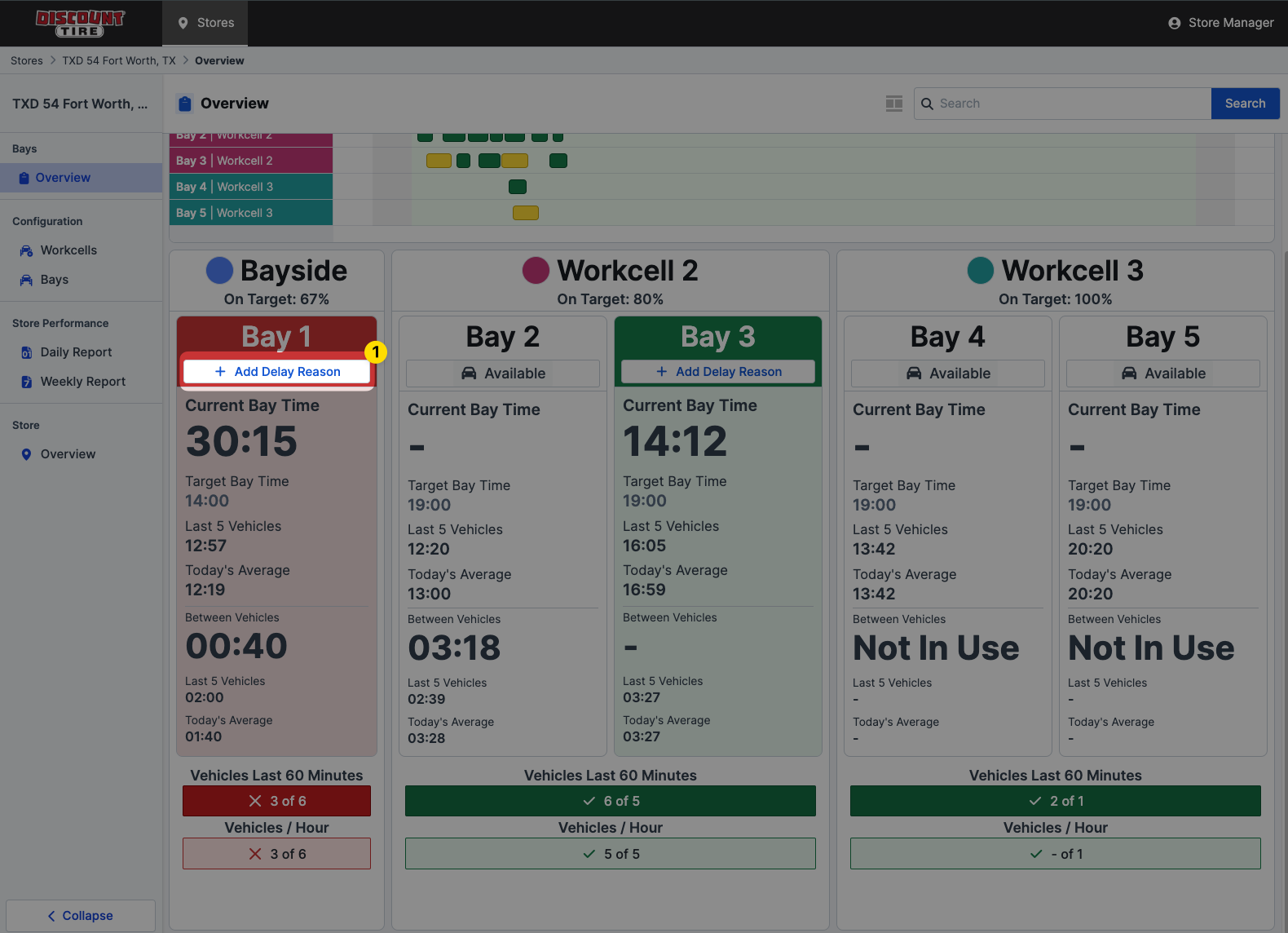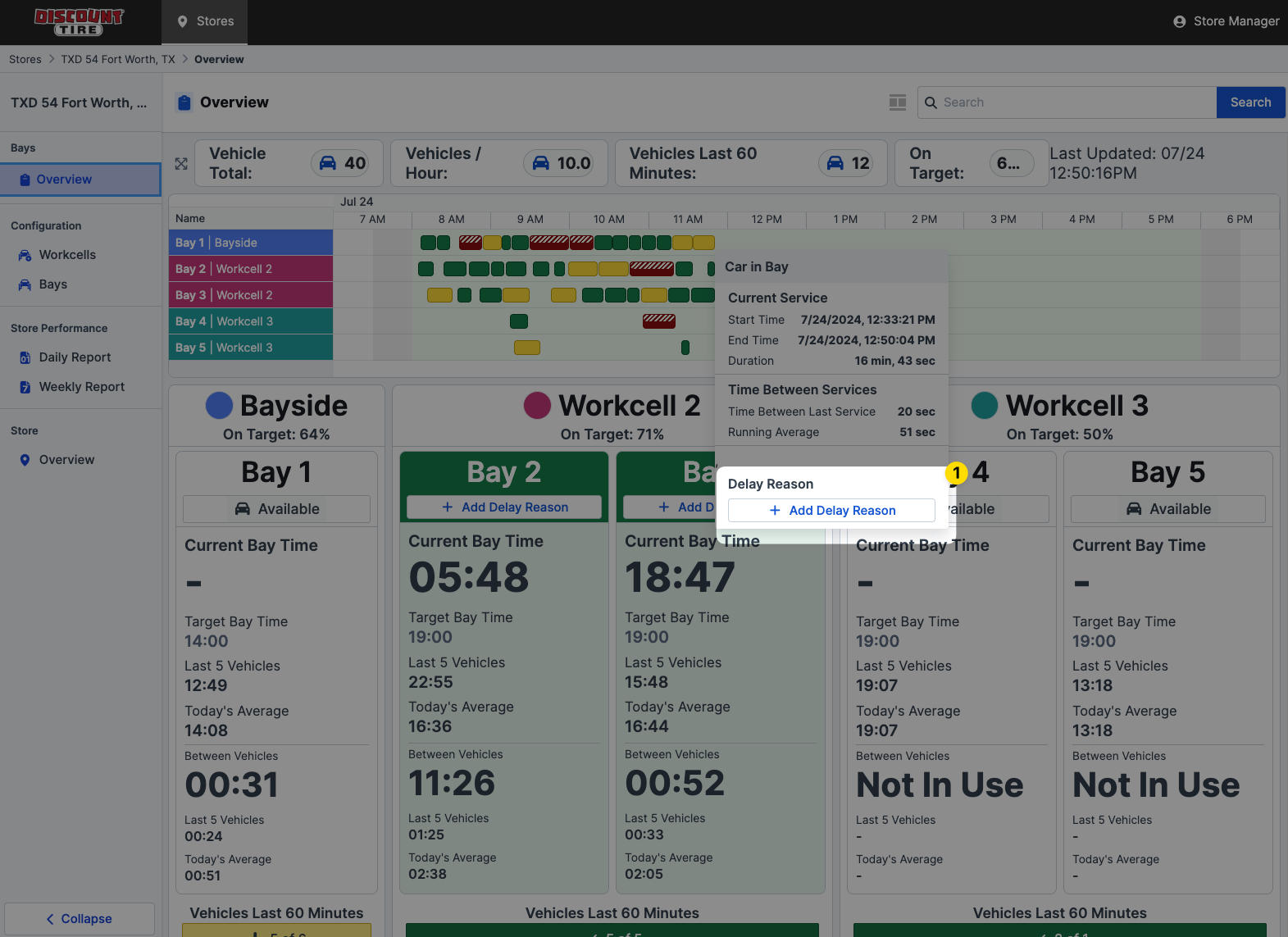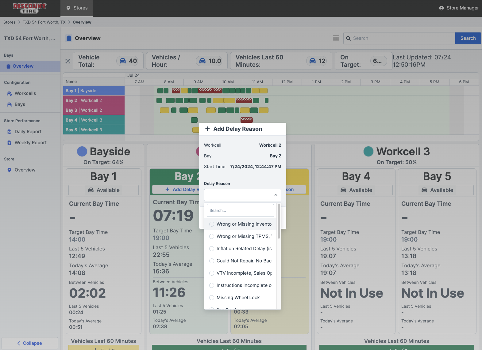 The Store Manager Dashboard can input a delay reason for a vehicle on the Store Manager Dashboard, by using two different methods: on the bay card during a service or on the Gantt chart after a service is complete.